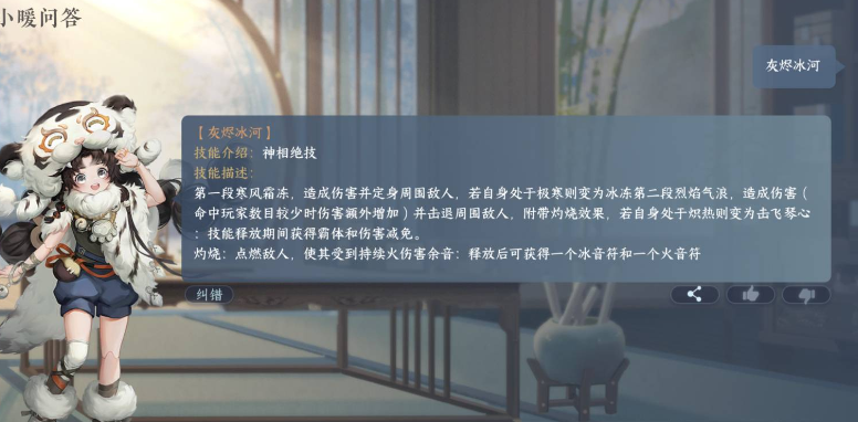 技能描述;第一段寒风霜冻,造成伤害并定身周围敌人,若自身处于极寒则变为冰冻第二段烈焰气浪,造成伤害(命中玩家数目较少时伤害额外增加)并击退周围敌人,附带灼烧效果,若自身处于炽热则变为击飞琴心。技能释放期间获得霸体和伤害减免。