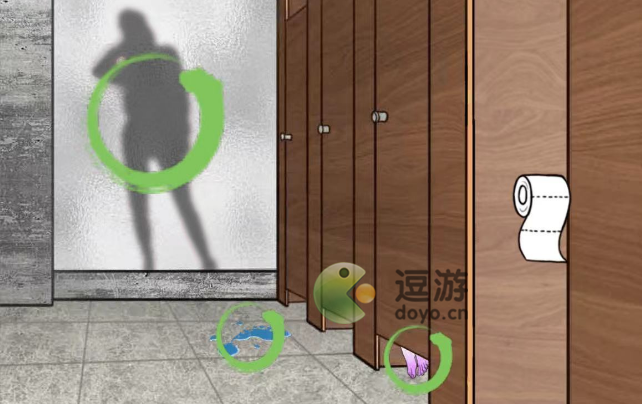 3、然后来到卫生间场景,先点击右边门,拖动卫生纸到女鬼门前;接着点击影子、湿脚印、女鬼脚