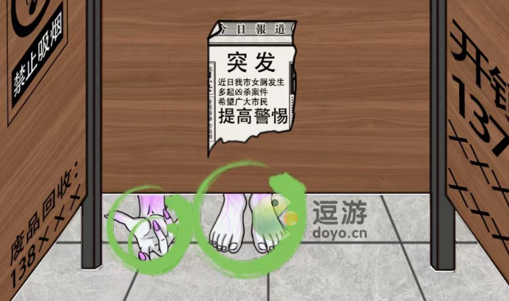 1、汉字找茬王公厕恐惧,需要想办法从厕所逃生,首先点击门上的报道