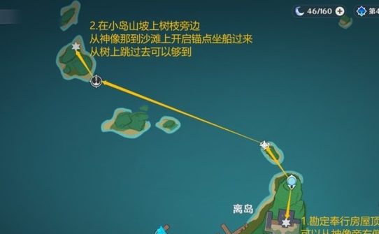 2:在小岛山坡上树枝旁边从神像那到沙滩上开启锚点坐船过来从树上跳过去可以够到