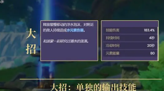 释放缓慢移动的浮水泡沫,对附近的敌人持续造成水元素伤害,效果持续4秒,冷却20秒,耗能80点。