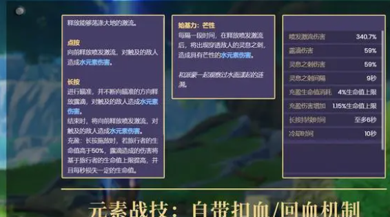 天赋2:长E消耗生命值时,按消耗生命值的45%提升喷发激流的伤害,至多提高5000点。此效果为基础伤害,可享受角色自身的伤害加成和暴伤加成。