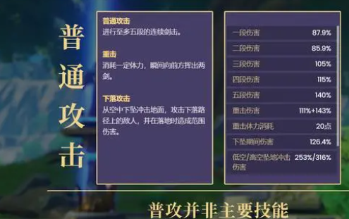 常规单手剑攻击,普攻5段5伤,10级总倍率533.8%。重击1段2伤,10级总倍率254%。