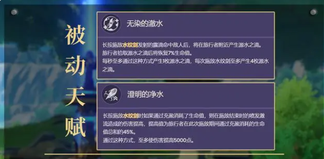 天赋1:长E发射的露滴命中敌人后,在角色附近产生源水之滴,至多产生4枚,旅行者拾取后恢复7%生命值。注意,源水之滴的回血效果仅对主角自身生效,队友无效。