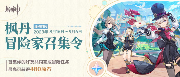 提瓦特大陆之旅开启新篇章,召集你的好友在水之国枫丹重聚,共同完成冒险任务最高可获得480原石。活动期间旅行者通过分享活动、邀请回归旅行者绑定召回码、被邀请的回归旅行者完成网页冒险任务等行为获得活动道具信封。信封可用来兑换原石、摩拉奖励。