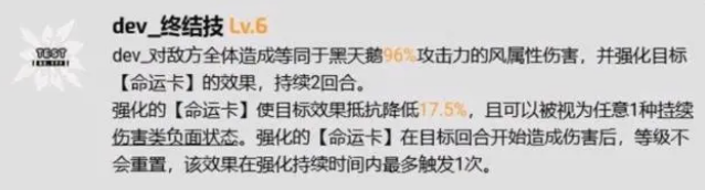 对指定敌方单体造成等同于黑天鹅X%攻击力的风属性伤害,有X%的基础概率为目标施加命运卡。攻击陷入风化,裂伤,灼烧或者触电状态的目标时,分别各有X%的基础概率额外对目标施加命运卡。