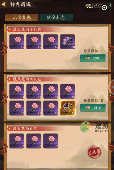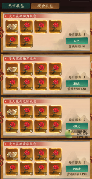 4、花来源:每天免费赠送7朵粉玫瑰,520元宝礼包含45朵粉玫瑰/个(每天限购1个),1314元宝礼包含105朵粉玫瑰/个(每天限购5个),现金礼包6-648元不等(内含红玫瑰和浪漫花束)