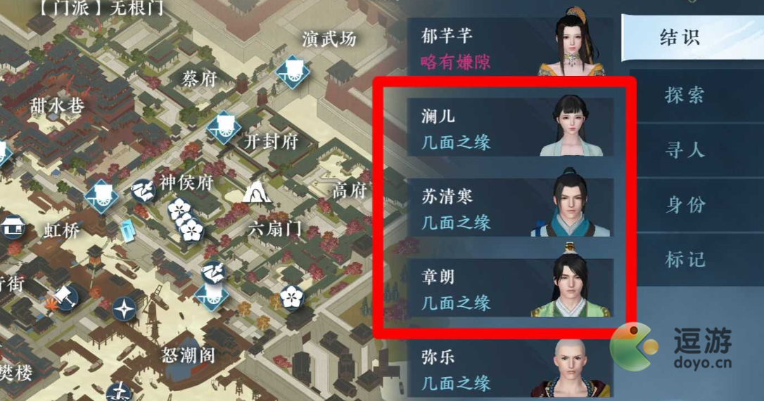2、我们需要先在汴京分别与澜儿、苏清寒和章朗对过话,把他们的结识标志都弄出来,方便我们找人