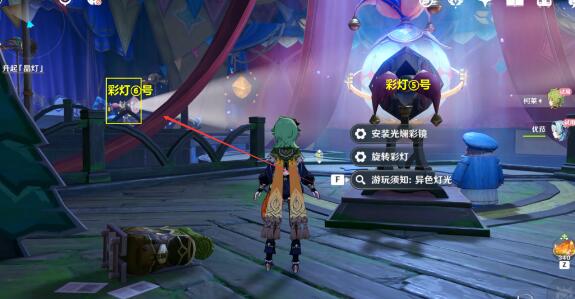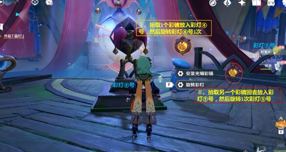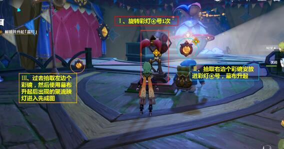 过去拾取彩镜(拾取彩镜后会出现一堆史莱姆,记得清理掉,不然无法安装彩镜),然后再回到②号彩灯安装彩镜,幕布升起后进入幕布里;
