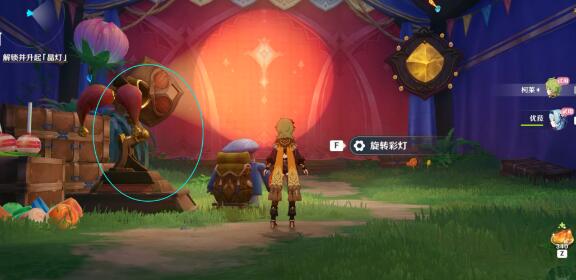 ●解锁并升起「晶灯」。靠近彩灯①号点击“旋转彩灯”,幕布升起后进入幕布里面;