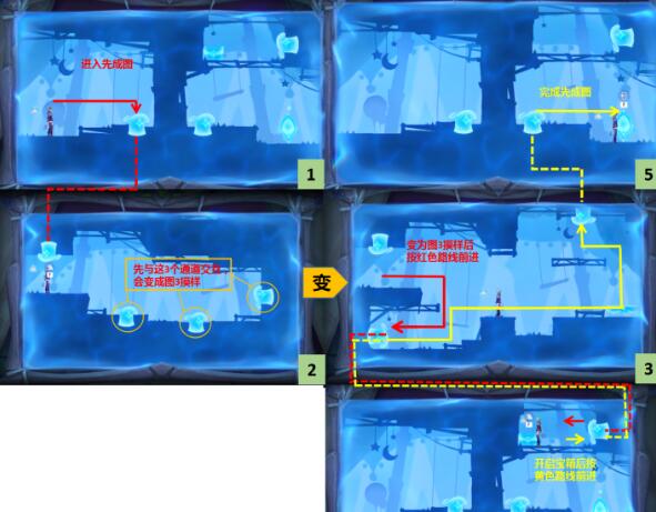 按照下图顺序操作(注意身上的彩镜别被⑤号的白色光束照到,被照到彩镜会融化,需要重新回去再拿一遍);