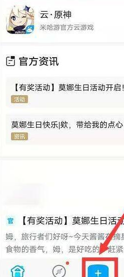 1、玩家进入mi you she后点击下面的加号;