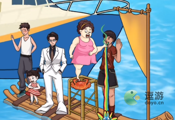 1、汉字找茬王海上遇险,需要帮救生船减重,首先向下拖动壮汉身上的前3件衣服到水中