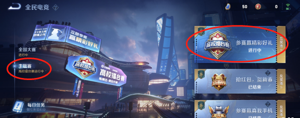 2、进入之后点击左边菜单栏里面的【主题赛】选项,再点击右边的【高校擂台赛】即可,进入完成比赛之后就可以完成高校认证哦。