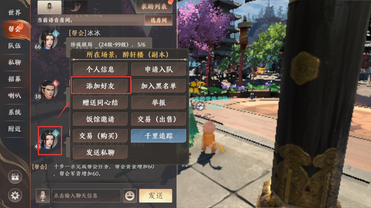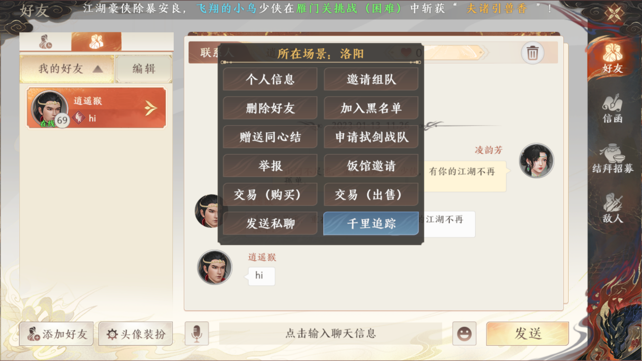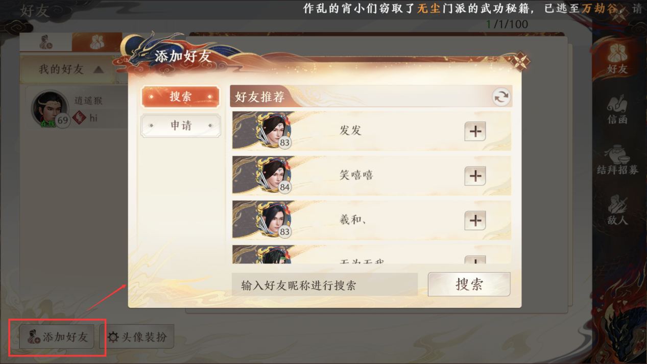 少侠可以点击想要添加的侠士【头像】-【添加好友】,对在线的侠士发送好友申请。