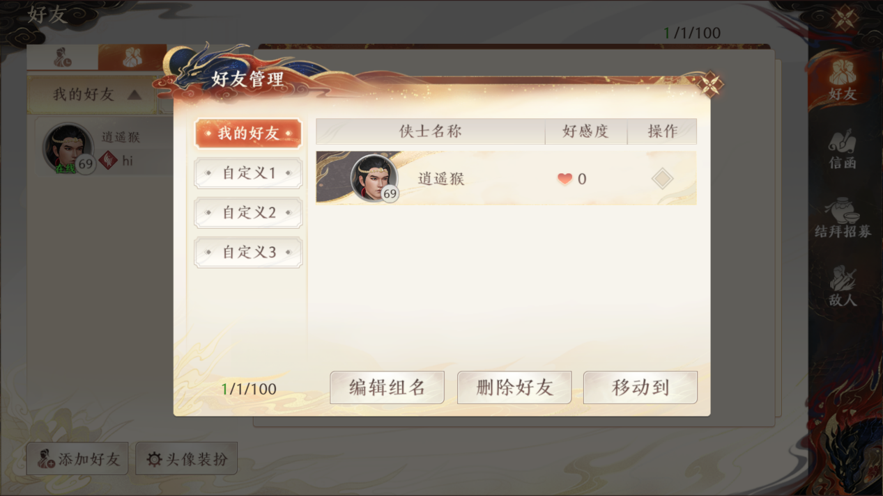 在【我的好友】界面,少侠可以对自己的好友进行【分组】/【移动分组】/【删除好友】等操作。
