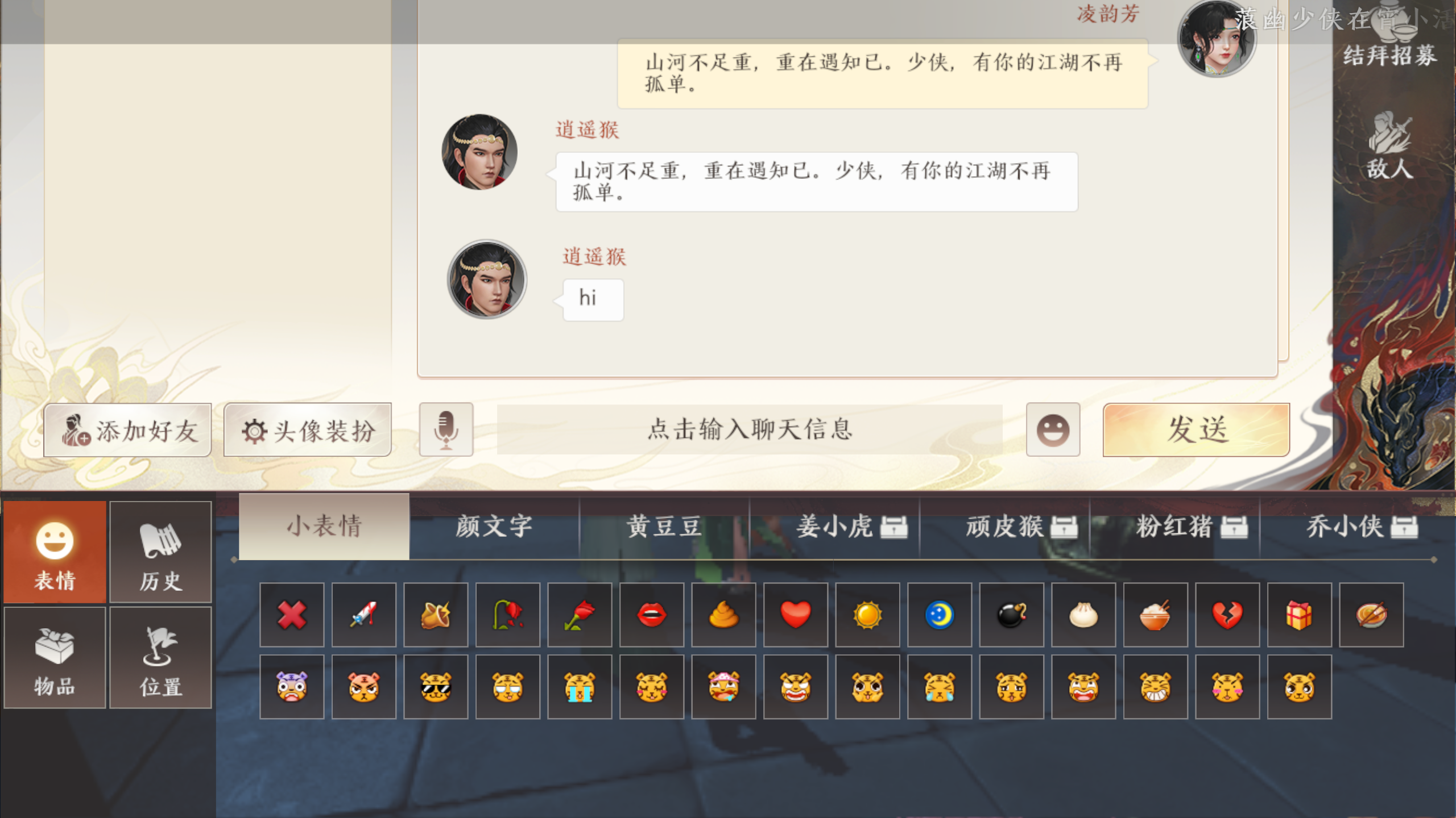 可以点击【输入聊天信息】给自己好友发送表情、信息、物品、位置等内容,也可以点击【话筒】图标发送语音信息。