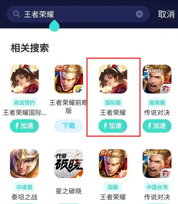 1、第一步:打开UU加速器,搜索“王者荣耀”,点击搜索结果开启免费加速。