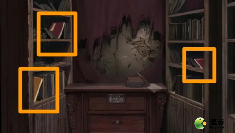来到密室中,点击左右书柜上颜色鲜亮的三本书查看线索。