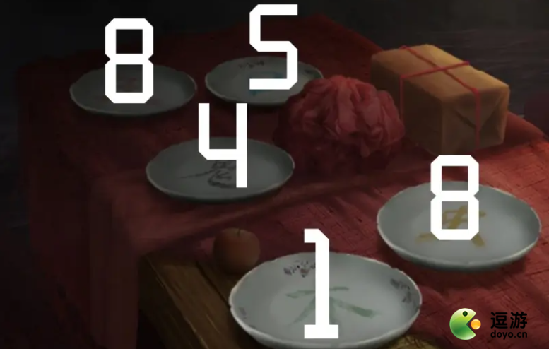 来到房间一,点击左下角的桌子,可以看到桌子上有五个圆盘,每个圆盘中各有一个颜色,且不同文字,每点击一次盘中都会多一个馒头,对应刚才得到的文字线索,可知,“红色王”盘子里放8个馒头,“蓝色口”盘子里放5个馒头,“黑色鬼”盘子里放4个馒头,“绿色木”盘子里放1个馒头,“黄色虫”盘子里放8个馒头。