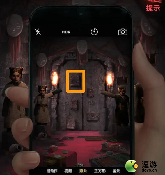 拿出手机观看两个门童指的位置(高能预警)按照他们所指的方块点击,点击过后再次拿出手机观看指的下一个方块,依次类推,几次之后石门打开(高能预警)。