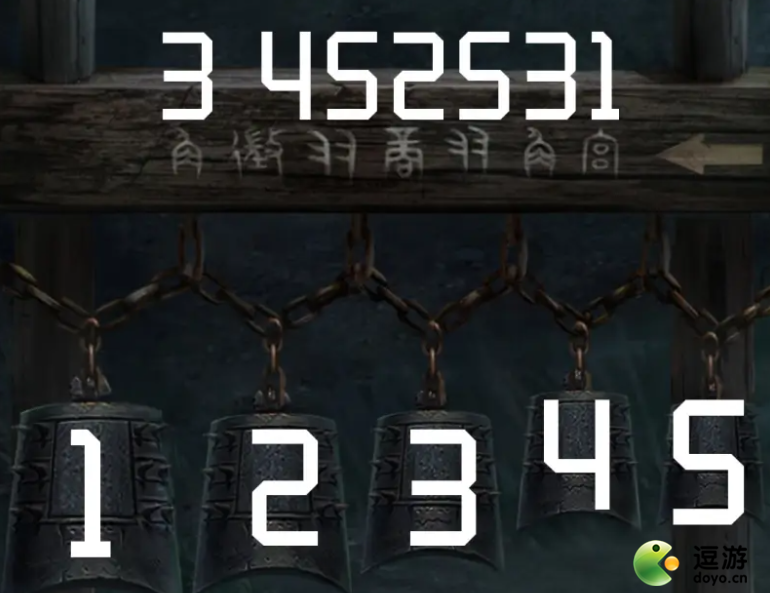 每点击一个编钟都可以看到它身上对应的字符,将编钟编号自左到右为12345,则根据编钟上图案的顺序,从右至左依次按照数字顺序点击编钟,点击成功后获得一个泥叫叫。