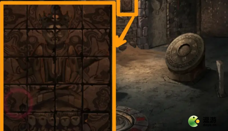 来到房间二,点击左侧密室门,将获得的两块石板放置在密室门的空缺处,随后密室门自动打开。