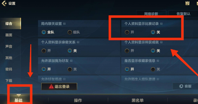 2.在设置界面点击最下方第一个”基础“,再点击”综合“,即可在该界面看见”个人资料显示比赛记录“选项,关闭该选项,即可隐藏战绩。如下图所示: