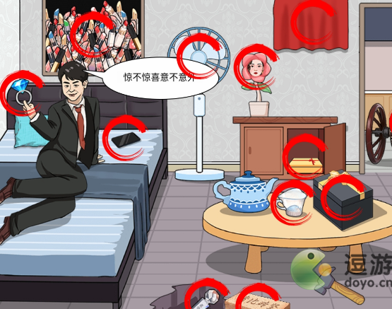 1、就你会玩文字七夕礼物,需要找到全部七夕礼物,首先男人手里是钻戒,点击风扇找到爱的风扇