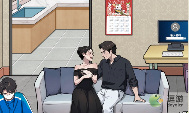 3、点击厨房门,拖动水桶到女生身上,拖动黄豆到男主身上