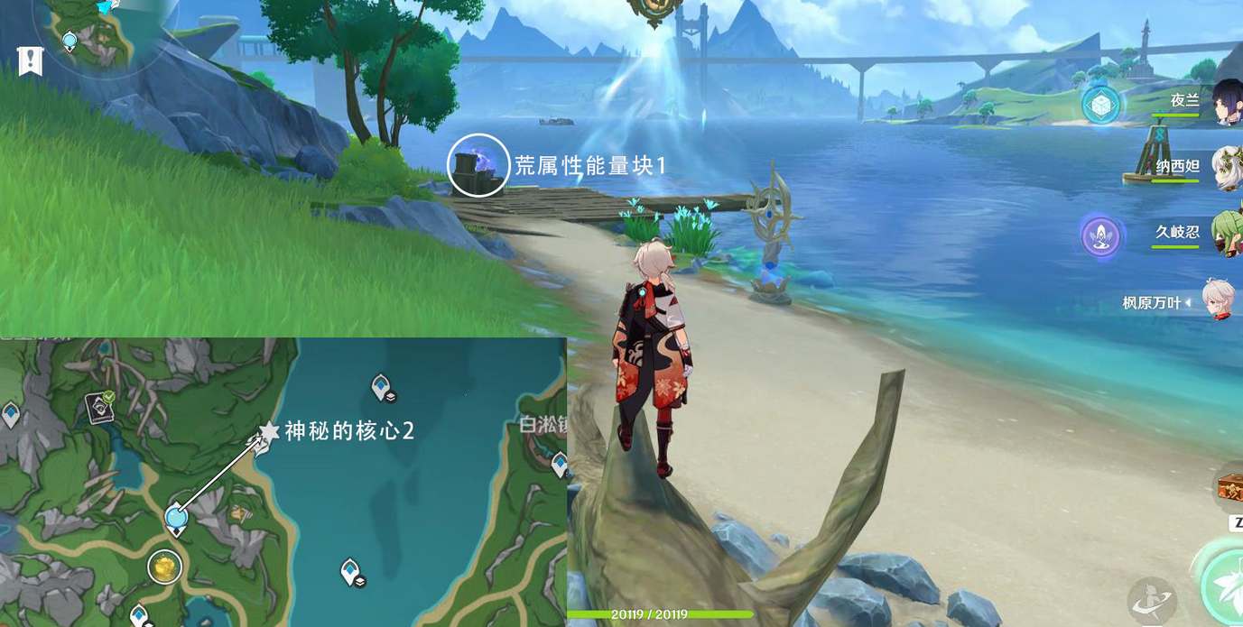 第二个神秘核心在苍晶区神像往地图的东北方,在水边拾取荒属性能量,射击装置