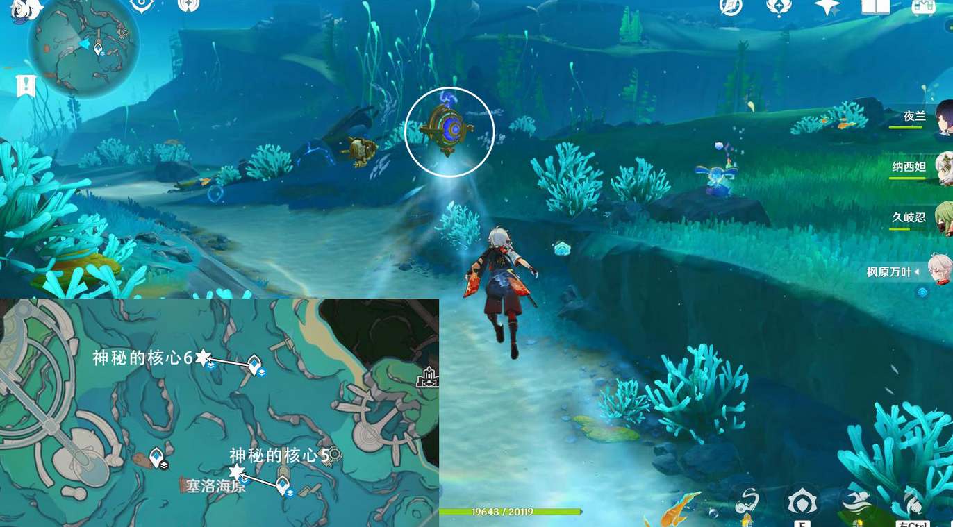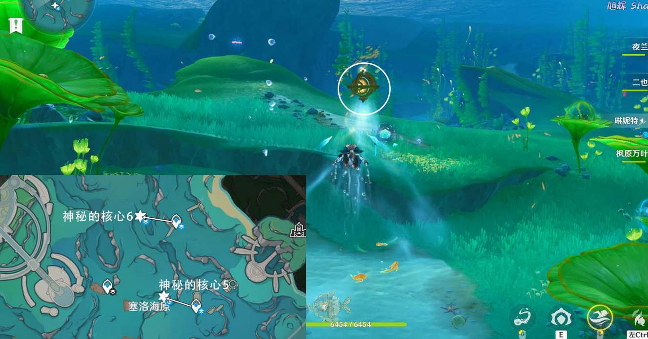 第五个核心在传送塞洛海原东方向锚点,往地图的西北方向游可以找到。