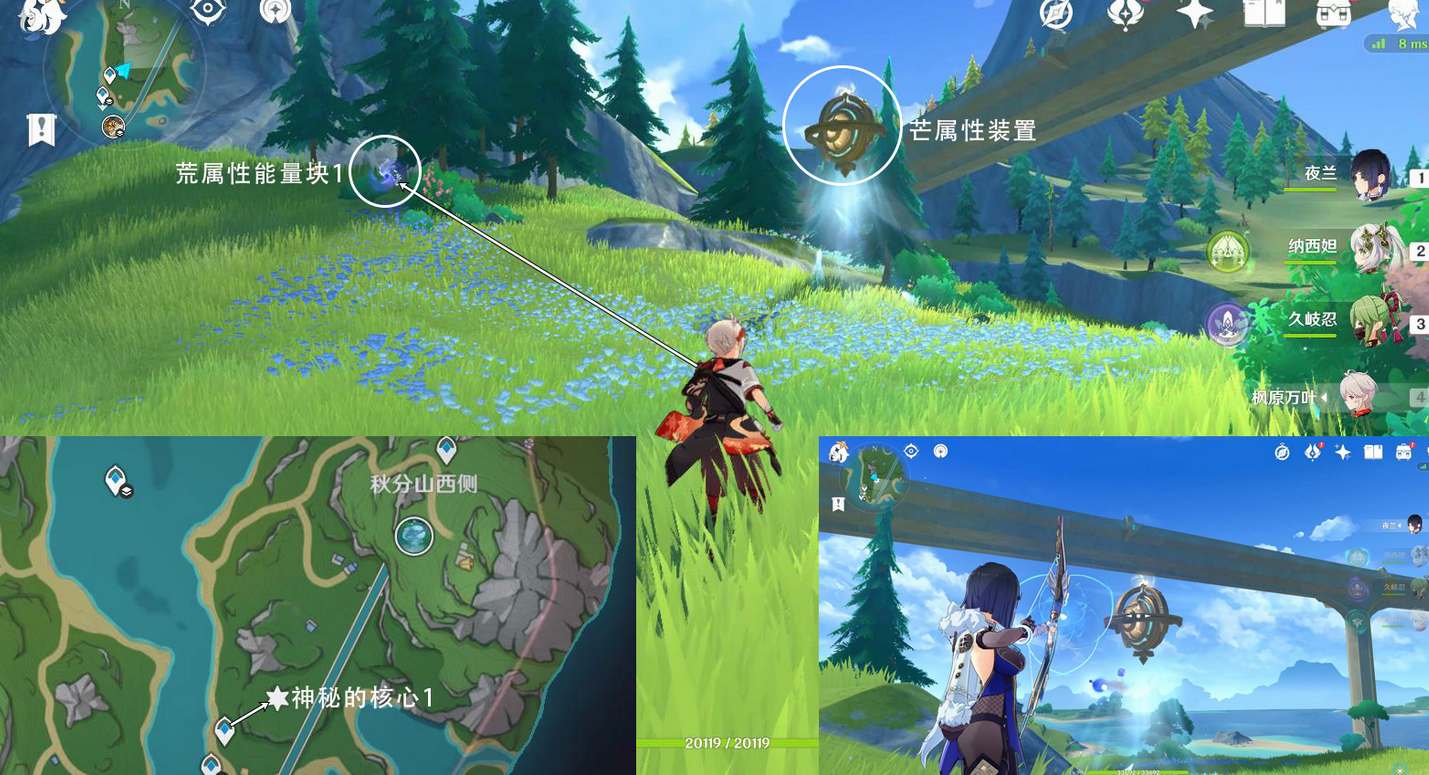第一个神秘的核心在传送白露区西南方向锚点,往地图的东北方向走。解密就是拾取能量块,射击装置,清理发条机关,重复循环2次即可。