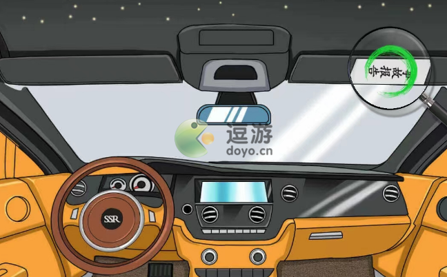 3、接着切换到车内,将放大镜移动到后视镜上、方向盘上、脚刹上、手刹上、右边抽屉、左边车门上、右边车顶处