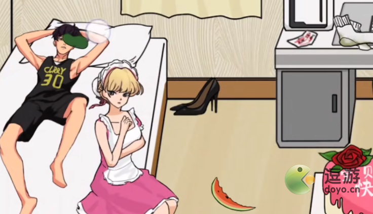 3、点击打开窗帘,给女生穿上高跟鞋,再移动到窗户