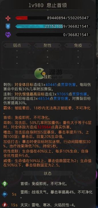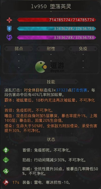 BOSS暴击恢复20%血量,被动每次攻击增加自身暴击率。扛不住的吃打击抗性药,带铸魔武器致盲杖或者马车减速杖。刮痧选择带群宝,晨星打控制流会比较好。