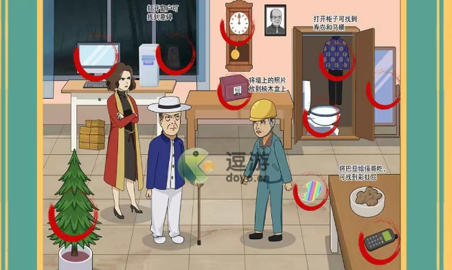 1、疯狂文字启强认爹,需要帮启强凑够认爹礼金,首先点击电脑、松树盆栽、墙上的钟、镜子、桌上的小灵通