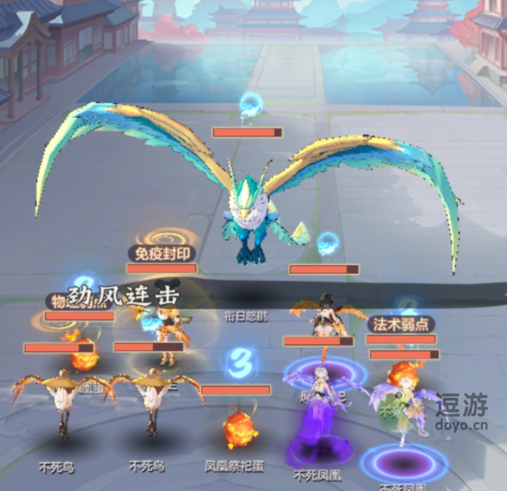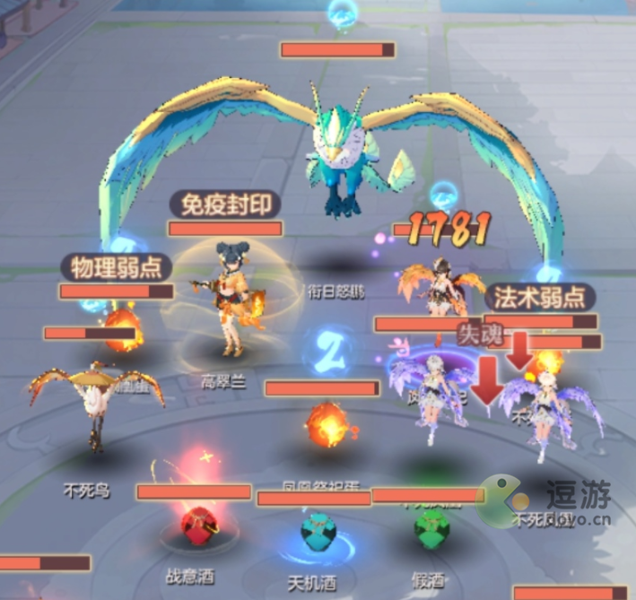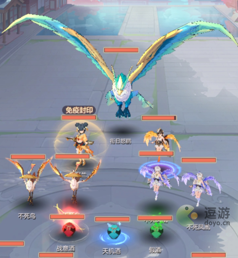 首回合开始,优先打掉战意酒与天机酒,封印BOSS下面的那只金色翅膀的凤凰(这只凤凰会封印人)