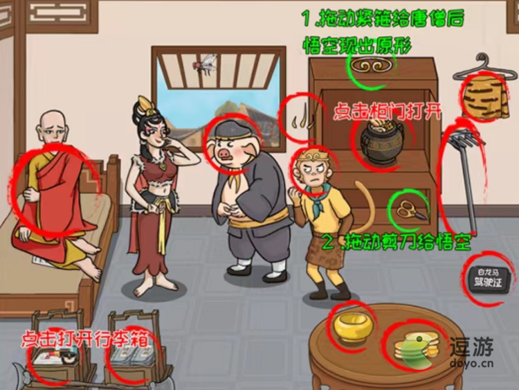 3、打开行李箱找到化妆品和经书,点击打开柜子获得佛跳墙,即可成功凑齐保释金