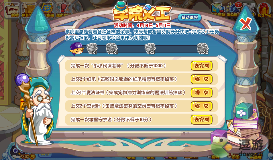 洛克王国学院义工共包含五项内容,包括刷野怪提交材料、完成小游戏,完成义工任务积累活跃度,还可领取经验果作为奖励哦。以下是洛克王国学院义工活动攻略,一起来看看吧。