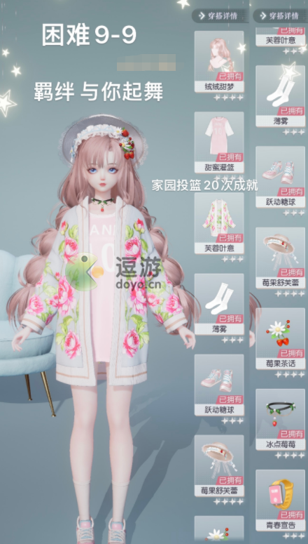 1、搭配:发型-绒绒甜梦,连衣裙-甜蜜灌篮(家园投篮20次成就)、外套(芙蓉叶意)、袜子-薄雾、鞋子-跃动糖球、帽子-莓果舒芙蕾、头饰-莓果茶话、项链-冰点莓莓、腕饰-青春宣告