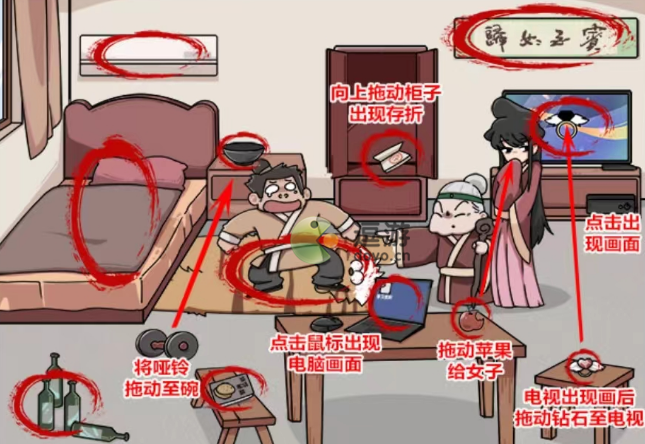 2、然后向上拖动柜子找到存折,将哑铃拖动至碗找到铁饭碗