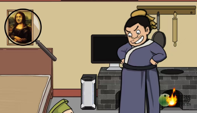 4、拖动放大镜点击:电脑主机-显卡,床上-金条,孙子兵法-房产证,墙上画-名画,灶台-金砖。