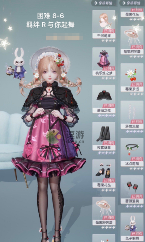 1、困难8-6过关搭配:连衣裙-桃乐丝之梦(工坊制作),外套-蔷薇之夜,袜子-夜雾谜章,鞋子-莓果花丛,帽子-莓果舒芙蕾,头饰-莓果茶话,耳饰-落雪流星,颈饰-冰点莓莓,腕饰-蔷薇落腕,悬浮-兔子伯爵,羁绊-R与你起舞