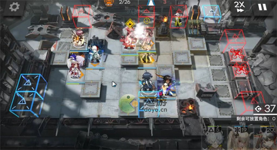 2.费用回复好撤退极境下塞雷娅,(怪刚好到塞雷娅那边现行,怕漏就左移一格)桃金娘开完技能下孑(棘刺打掉箱子那边→);