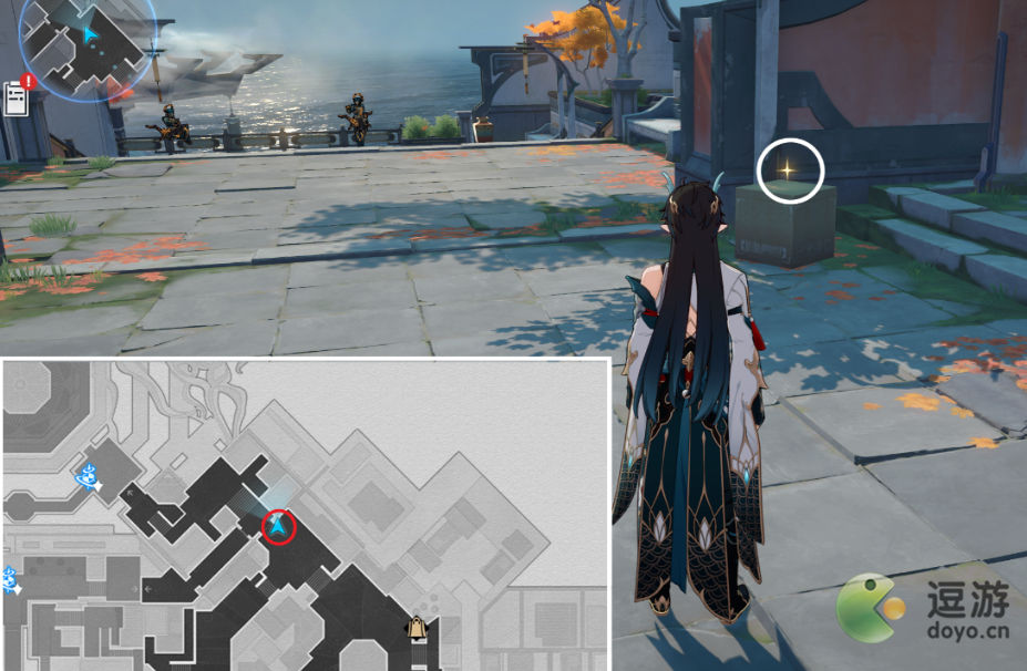 1、首先我们来到丹鼎司的北部,调查墙壁的箱子