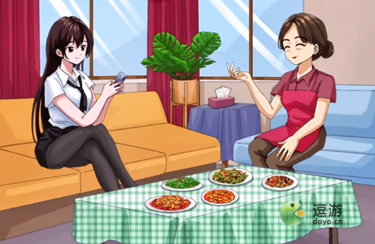 1、汉字找茬王放假回家,需要找到他们正确的表情,首先第一天妈妈在沙发右边慈祥表情,女儿在沙发左边放松表情,满汉全席。