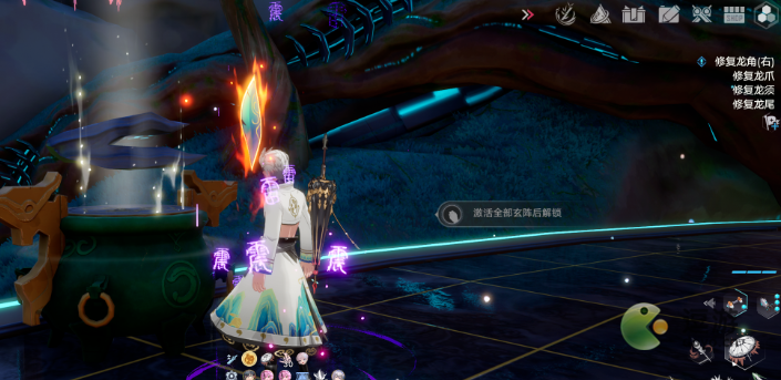 龙爪获取的过程是一个小任务,大家可以在寅郡南边如图所示的地方发现一个绿色的大鼎,触碰鼎之后,系统会让我们参与四次考验,也就是四个小游戏。第一次是随着风的流动往前走,第二次是跟着月光的指向,第三次是跟着树叶的吹动,最后一次是跟着萤火虫光的指引。等到所有的任务都完成之后,我们会解锁青铜鼎旁边的“青龙之剑”,这把剑会把我们带到一个浮空的小岛上。