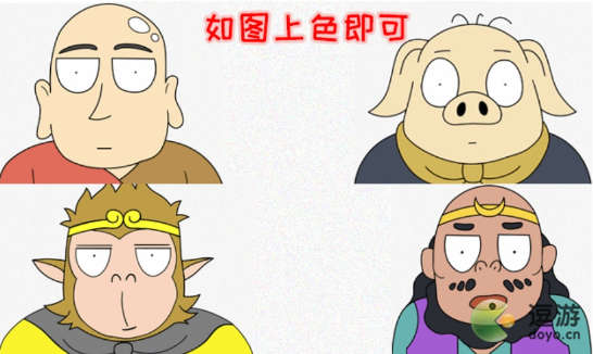 1、西游梗传彩绘师兄弟,需要给师徒4人填上正确的颜色,首先点击蜡笔,再点击图中线条区域即可填充对应颜色