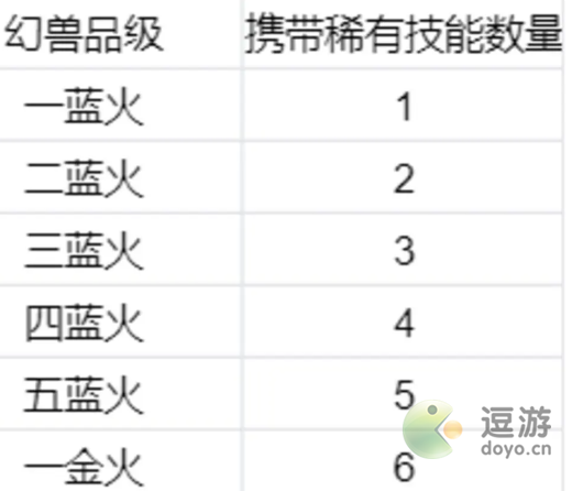 幻兽可升至最高5星,当升至5星时,会根据携带稀有技能的数量而在交易行中显示蓝火/金火。五星才是幻兽的起点
